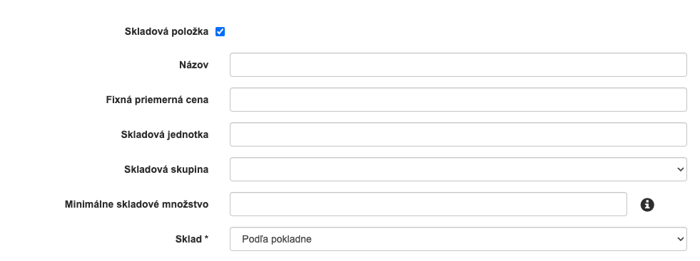 Skladová položka sa vytvára iba v sekcii Sklad → Skladové položky, kliknutím na ikonu +
