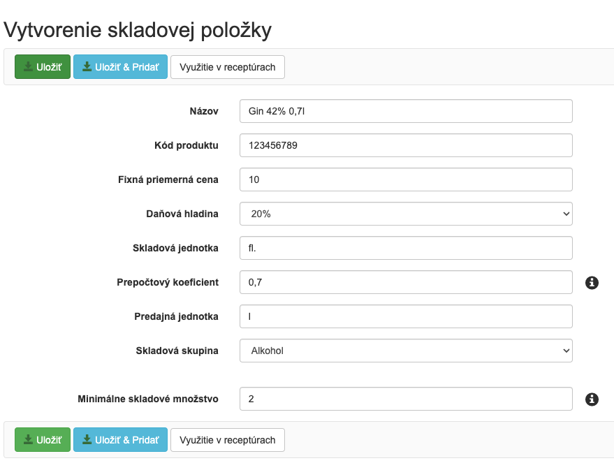 Po uložení položky sa vytvorí skladová karta spolu s receptúrou prepojenou na danú predajnú položku. Pri predaji 1ks tejto položky sa vždy zo skladu odpíše 1ks skladovej položky.